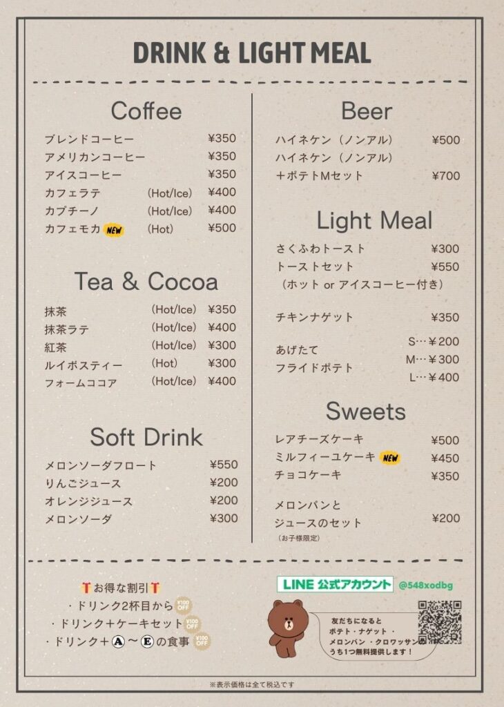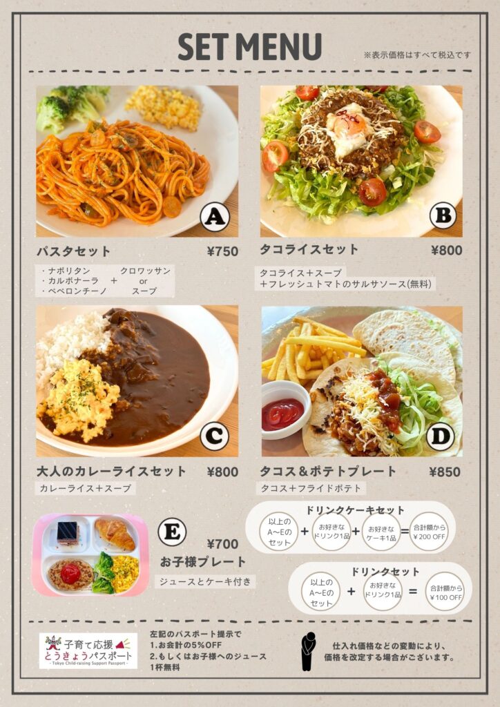 フェアトレードコーヒーやスイーツ、キッズメニューや、27種類のスパイスをした野菜たっぷり・ヘルシーなタコライスなどご用意しています。